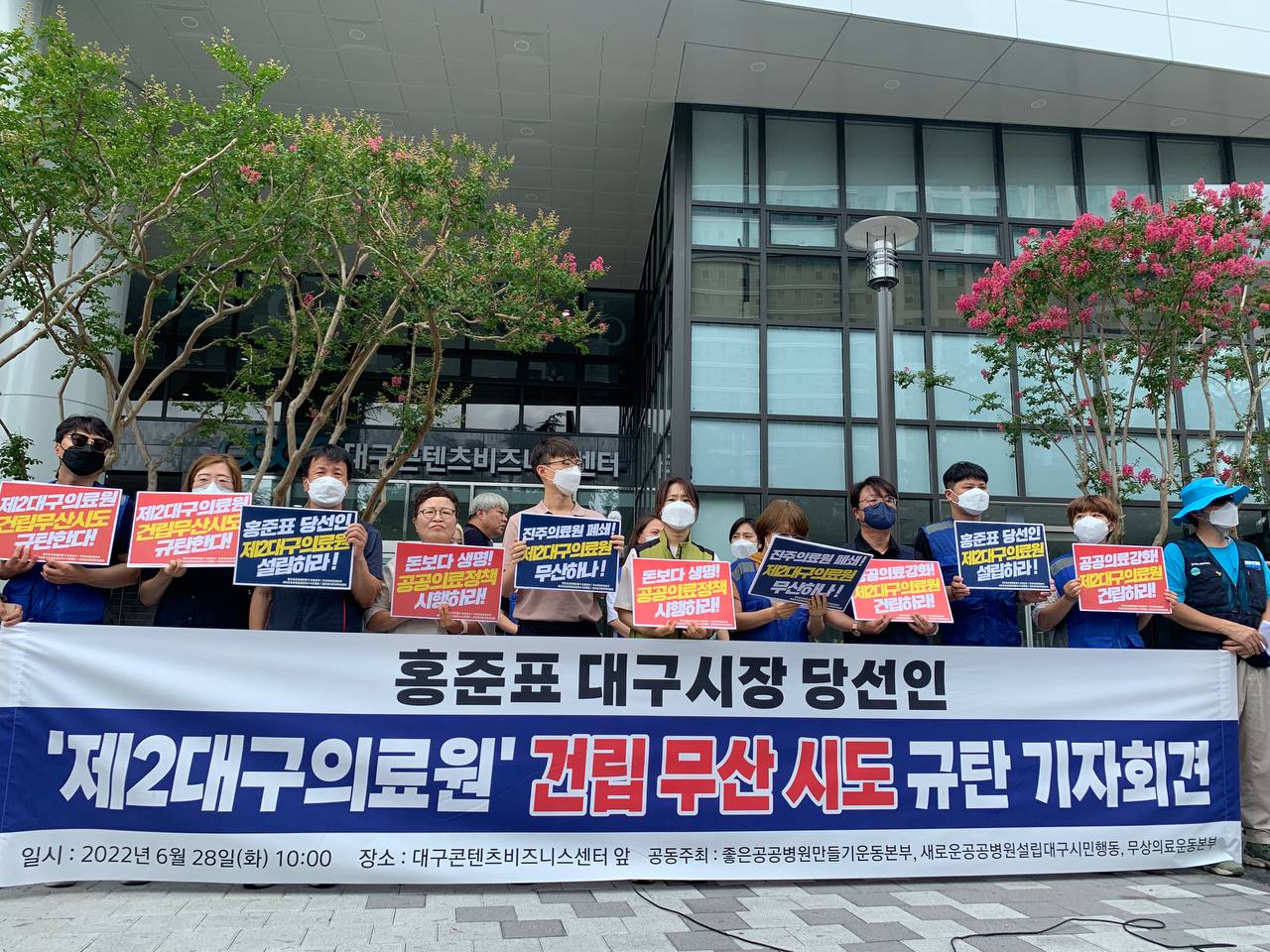 대구경북 코로나19 1차유행은 시민들 모두에게 공공의료의 중요성을 알려준 첫 계기였다. 그래서 대구시민들의 압도적 찬성 여론으로 제2대구의료원 설립이 공식화된 것이다. 홍준표 당선자가 이를 뒤집는다면 시민들의 의지를 거스르는 일일 뿐 아니라 말 그대로 시민의 생명과 건강을 위협할 결정이 될 것이다. 홍준표가 했다는 ‘한국에 의료민영화는 없다’는 말과 달리 이런 공공의료 파괴야말로 가장 직접적 의료민영화다.
