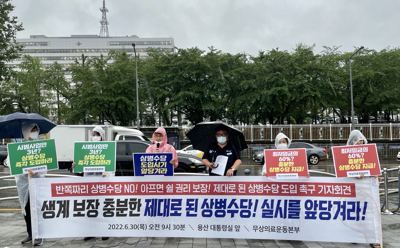 윤석열 대통령은 후보시절 상병수당을 최대한 빨리 도입하겠다고 약속한 바 있습니다. 이에 노동시민사회는 정부의 미흡한 상병수당 시범사업을 즉각 수정할 것을 요구하는 기자회견을 개최했습니다. 상병수당의 보장수준을 현실에 맞게 높이고, 시범사업 기간을 단축하여 제도를 즉시 도입할 것을 요구했습니다.