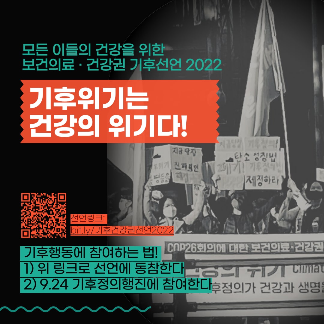 기후 변화를 막는 것이 인류의 건강을 지키는 길입니다. 기후 변화를 막기 위한 우리의 요구와 노력은 재난을 예방할 뿐 아니라 그 자체로 인류 건강을 증진시키는 길이기도 합니다. 건강을 최우선순위로 생각하는 보건의료인들과 건강권 연구자들이 이 일에 앞장서 나서야 하는 이유입니다. 우리는 아래와 같은 실천을 약속하며 선언에 함께합니다.