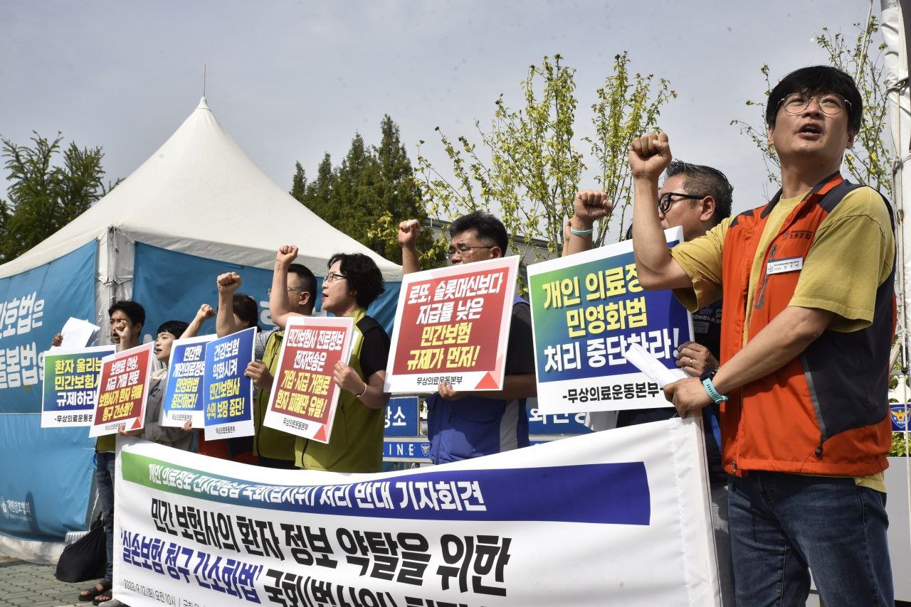 여기 모인 노동단체들과 시민단체, 그리고 환자단체들은 한 목소리로 이 법을 십여 년 전부터 반대해 왔다. 사회 구성원 대다수에 해당하는 노동자, 시민, 환자들이 이렇게 반대하는 법을 여기까지 끌고 온 국회는 누굴 위해 존재하나! 이 법은 오직 민간보험사들의, 민간보험사에 의한, 민간보험사를 위한 법일 뿐이다. 그들이 연간 수천억이라는 낙전수익을 스스로 포기하고 환자를 위해 이 법을 바란다고? 이 법은 환자들을 위한 것이 아니라 오직 보험사를 위한 것이다. 이미 여러 차례 보험사들의 거짓을 드러낸 바가 있지만, 오늘 다시금 이런 입장을 밝힌다. 국회는 보험업법 논의를 중단하고 법을 폐기하라.