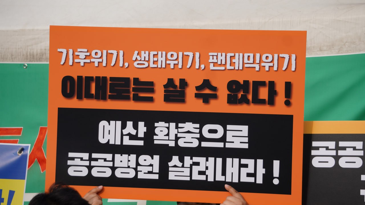 노동조합의 투쟁, 시민사회의 요구로 국회 상임위에서 공공의료를 비롯하여 복지예산, 연구개발예산이 일부 회복되었습니다. 지금 진행 중인 예산소위, 11월 말 예결위 전체회의에 내년도 국민의 삶과 노동자의 일자리가 걸려 있습니다. 정부와 국회에 분명히 요구합니다. 공공병원 예산, 공공서비스 예산을 충분히 확충하십시오. 경제위기 시기 국민의 삶과 일자리에 대한 국가의 책임을 다 해 주십시오. 그것이 국회와 정부의 존재 이유입니다.