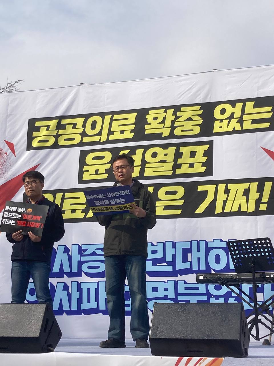 정부와 의사들의 이전투구에 우리의 미래를 맡길 순 없습니다. 오늘을 시작으로 전국에서 노동자 시민들의 목소리를 키워나갑시다. 어디서나 누구나 평등하게 건강을 누릴 수 있는 사회를 우리 손으로 만듭시다. 투쟁!