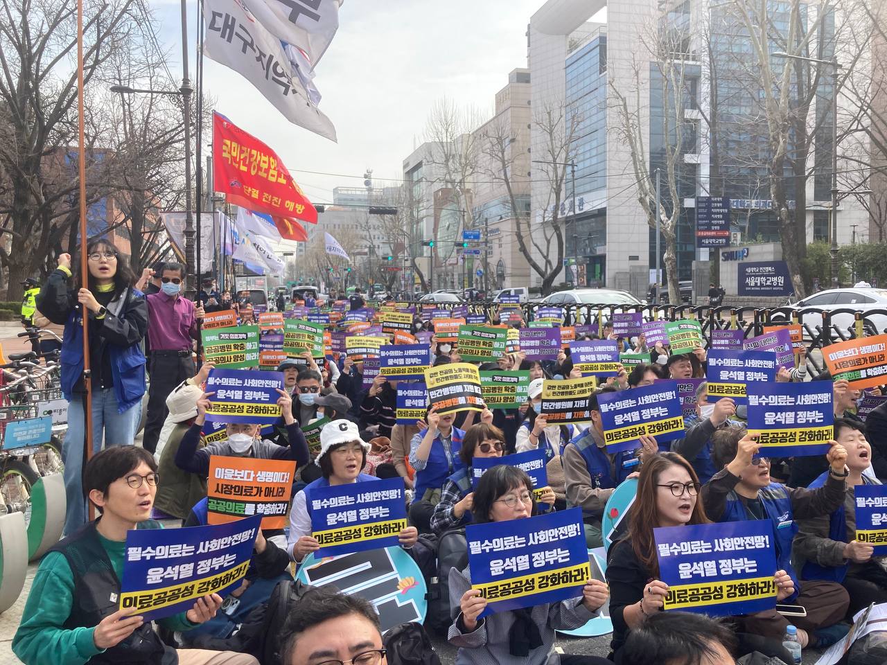 윤석열표 가짜의료를 타파하고, 지역 필수 공공의료를 위한 공공병원 확충과 공공의사 양성, 간호사 1인당 환자수 법제화를 통해 공공의료를 바로 세웁시다. 내 삶을 지키는 공공의료가 확충될 것입니다. 누가 국민의 생명을 지킬지는 정해진 것 같습니다. 함께 투쟁합시다. 투쟁!