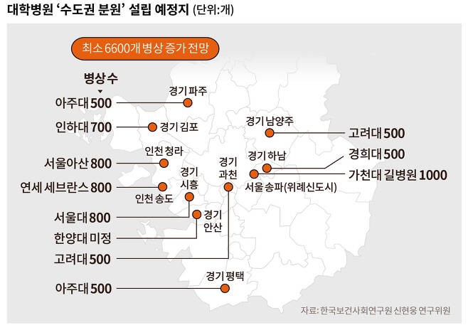 정부는 수도권 대형병원 신증설을 억제하겠다고 했지만, 10개 상급종합병원이 수도권에 짓는 6600병상에 소급적용되지 않는다. 정부는 “향후 신·증설시” 통제한다고 밝혔다. 2월 발표한 ‘필수의료 패키지’에도 ‘이미 추진 중인 신증설 병상은 불허되지 않는다’고 했다. 전국 의사와 환자를 흡수해 지역의료를 붕괴시킬 것이라고 평가되는 6600병상 대형병원 분원 설립을 막을 의지가 없다.