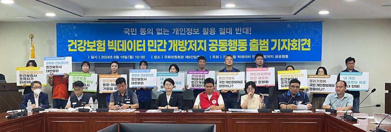 오늘 “건강보험 빅데이터 개방저지 공동행동”에 참가하는 500여개 노동시민사회단체 및 진보정당은 윤석열 정부에 분명히 요구한다. 건강보험 빅데이터를 민간보험사에 제공하려는 시도를 즉각 중단하라! 민간보험사 역시 공익적 목적이라는 허울뒤에 숨어 계속해서 건강보험 빅데이터를 확보하려는 시도를 중단하라! 국회는 건강보험 빅데이터 등 공공데이터의 민간 제공을 엄격히 제한하고 개인정보를 보호할 수 있도록 즉각 법안을 개정하라! 국민을 보호하지 않는 정부와 국회는 존재가치가 없음을 분명히 인식해야 할 것이다.