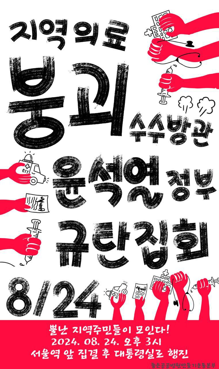 우리는 정부의 책임을 묻는다. 정부는 폐업한 민간병원을 인수해 공급을 대신하지도 공공병원을 확충하지도 않고 있다. 오히려 거꾸로 의료공급의 95%를 민간의료기관들에 맡겨놓고, 심지어 공공병원들에까지 수익성의 잣대를 들이민다. 최근의 의료대란에서 정부는 오히려 대형병원 인력을 메운다며 농어촌의 유일한 의사인 공보의를 차출하고 있다. 심지어 정부가 이런 수단까지 동원해 밀어붙이고 있는 의대증원안에도 지역에 의사를 충원할 방법은 전무하다. 게다가 정부는 건강보험 재정을 쌈짓돈처럼 민간의료에 퍼주고 있다. 정부는 우리의 생명을 담보로, 우리의 노동으로 유지되는 의료체계를 담보로, 엉뚱하게 도시 대형병원의 이윤을 지키려 하는가?
