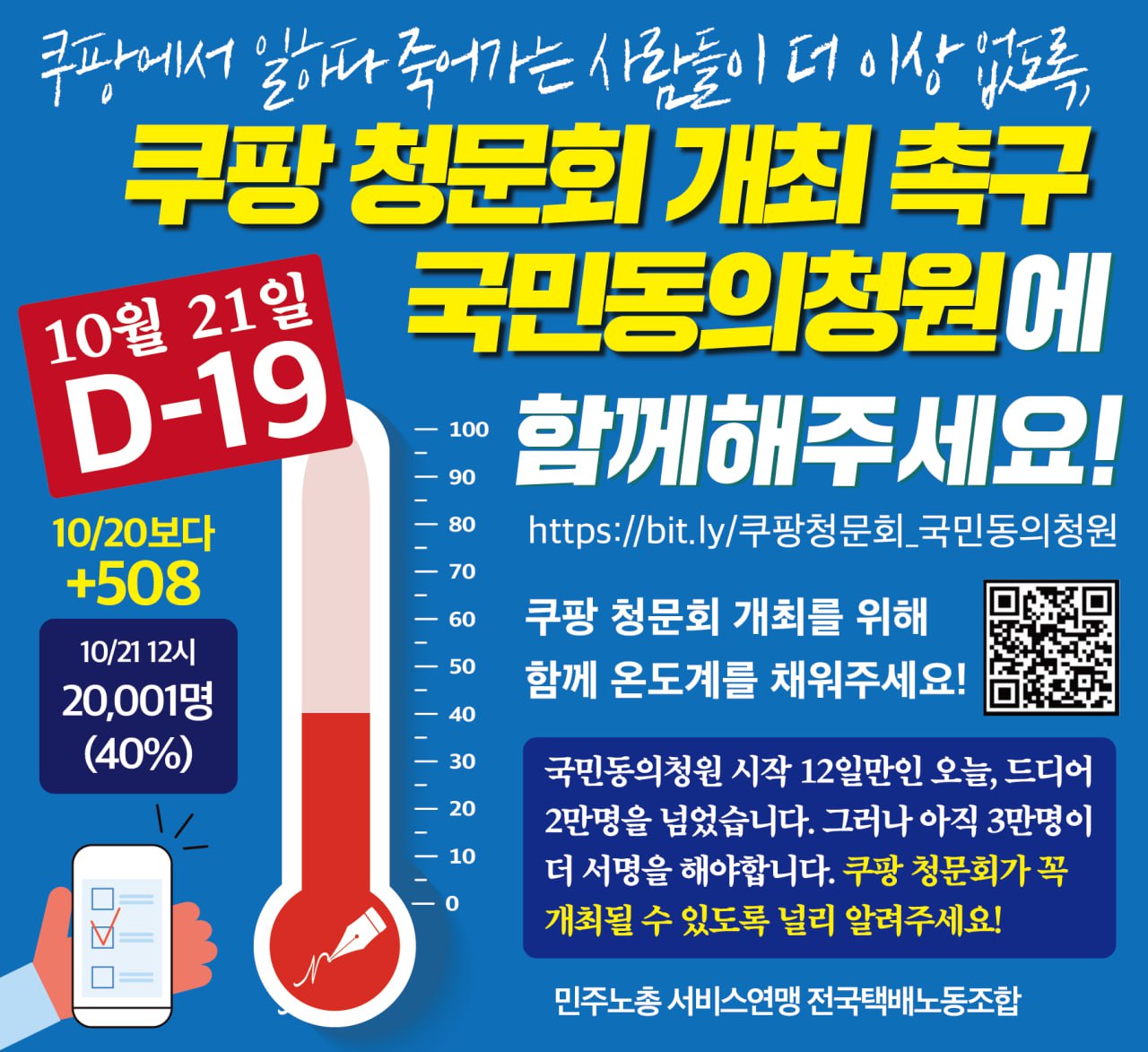 죽음을 부르는 로켓배송, 새벽배송! 쿠팡에 제대로 책임을 묻고 근본적인 해결책을 마련하기 위해 쿠팡 청문회 청원 하고자 합니다. 청원에 동참해주세요!