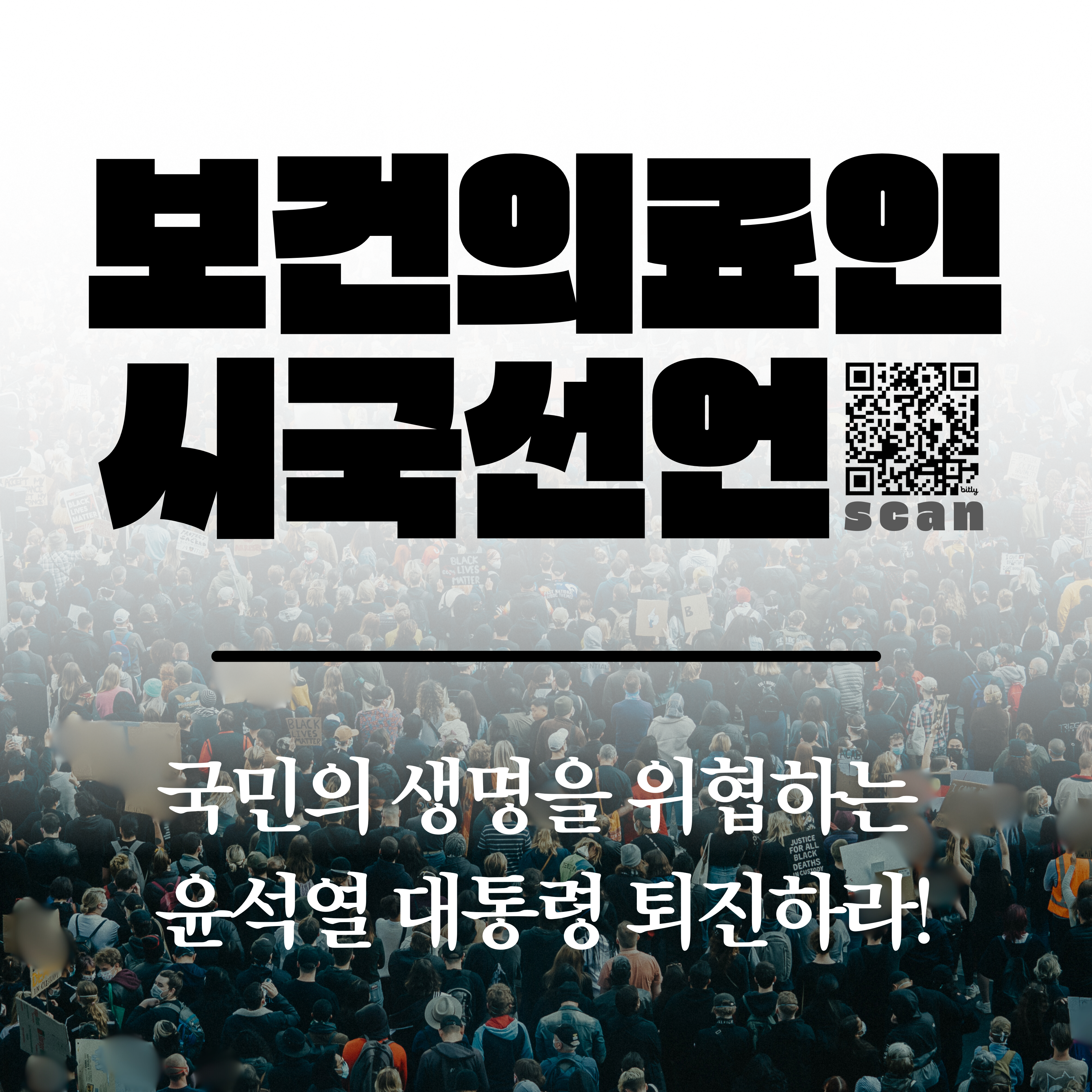 서민의 삶을 짓밟는 대통령, 민주주의를 우롱하는 대통령은 이제 자리에서 물러나야 합니다. 윤석열 대통령 퇴진을 촉구하는 보건의료인 시국선언에 함께해주십시오.