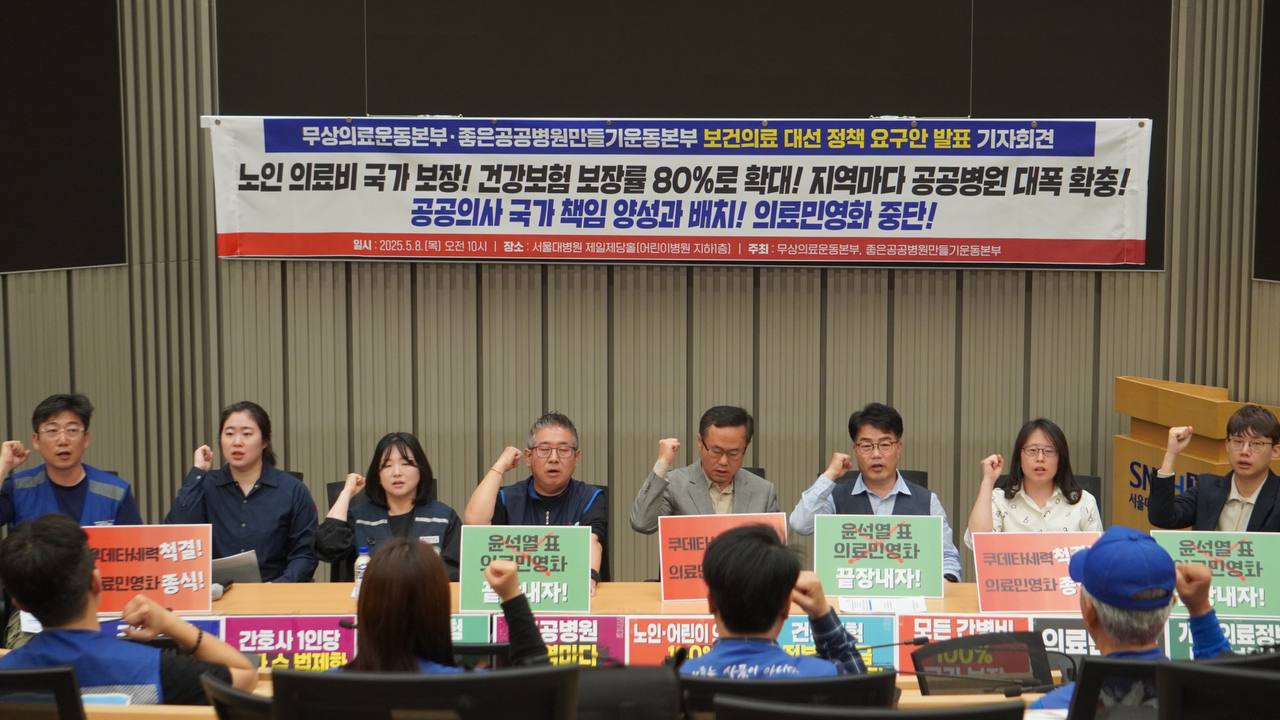 이를 위해 무상의료운동본부와 좋은공공병원만들기운동본부는 내란정당 국민의힘을 제외하고 대선에 나서는 모든 정당에 요구합니다. 국민의 건강과 생명을 위한 보건의료 대선요구안을 전폭적으로 수용하여 내란수괴 윤석열이 파괴한 공공의료와 건강보험을 되돌리고 의료민영화를 끝장내는데 함께해줄 것을 촉구합니다.