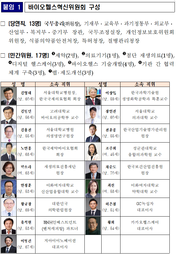 바이오헬스혁신위원회는 윤석열 정부가 만든 기구로 공익보다는 바이오헬스 산업 육성(이윤 극대화)을 위한 규제 완화 기구다. 20명의 위원 중에 그 흔한 시민사회단체 하나 없는 것을 보면 이 위원회가 얼마나 노골적으로 친기업적인지 알 수 있다.