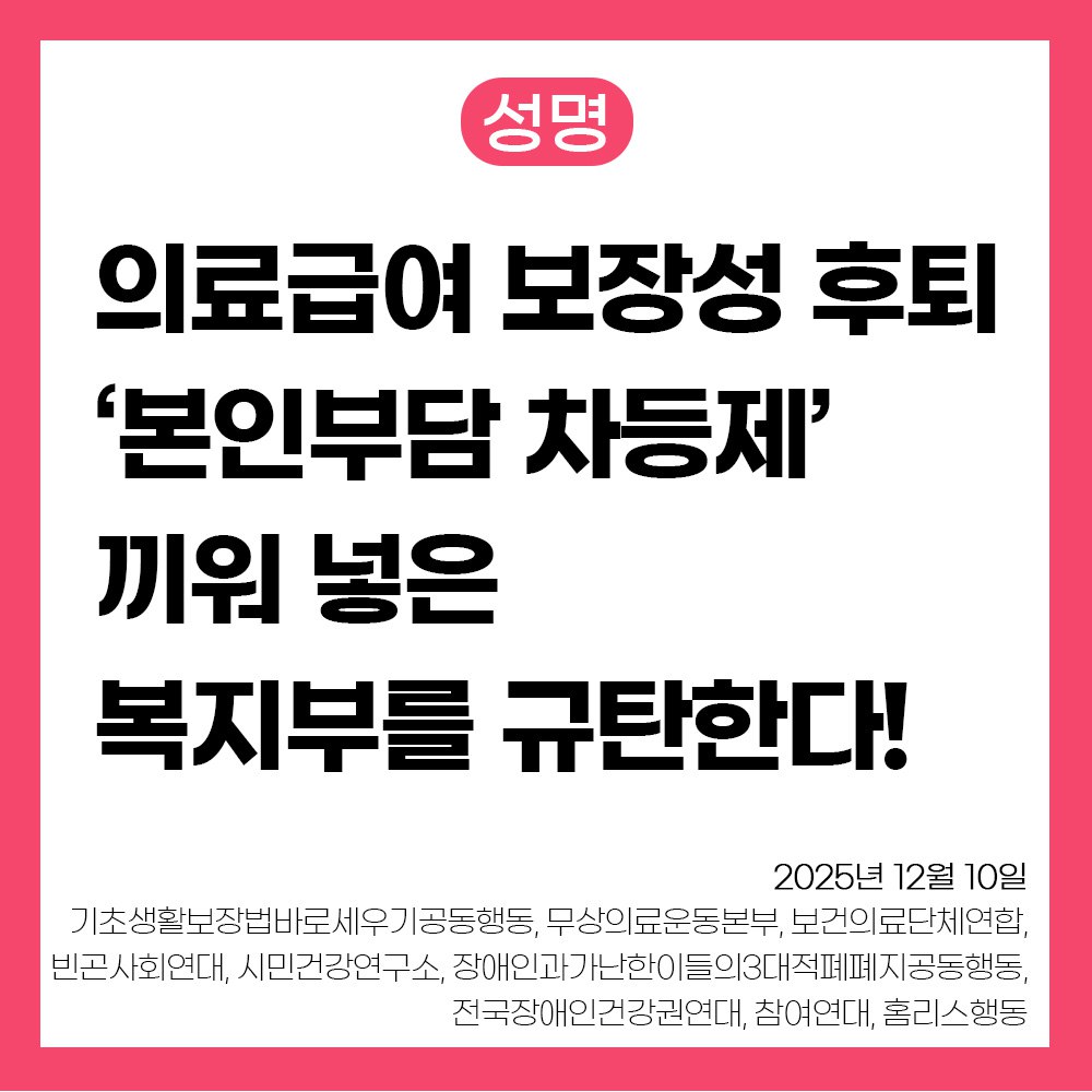 국민주권 정부를 표방하는 이재명정부에 윤석열표 정책을 계승할 것인지 묻는다. 의료급여 개악이 철회되지 않는다면 빈곤층의 비상사태는 끝나지 않는다.  의료급여 정률제 개악이 아니라, 병원을 자주 이용하는 이들에대한 실태조사와 적절한 건강 수준에 도달할 수 있는 정책 개선이 우선이다. 의료공급자 통제대책 없이 수급자만 잡도리하는 행태를 중단하고 정률제 개악 철회와 부양의무자기준 완전 폐지에 나서라.