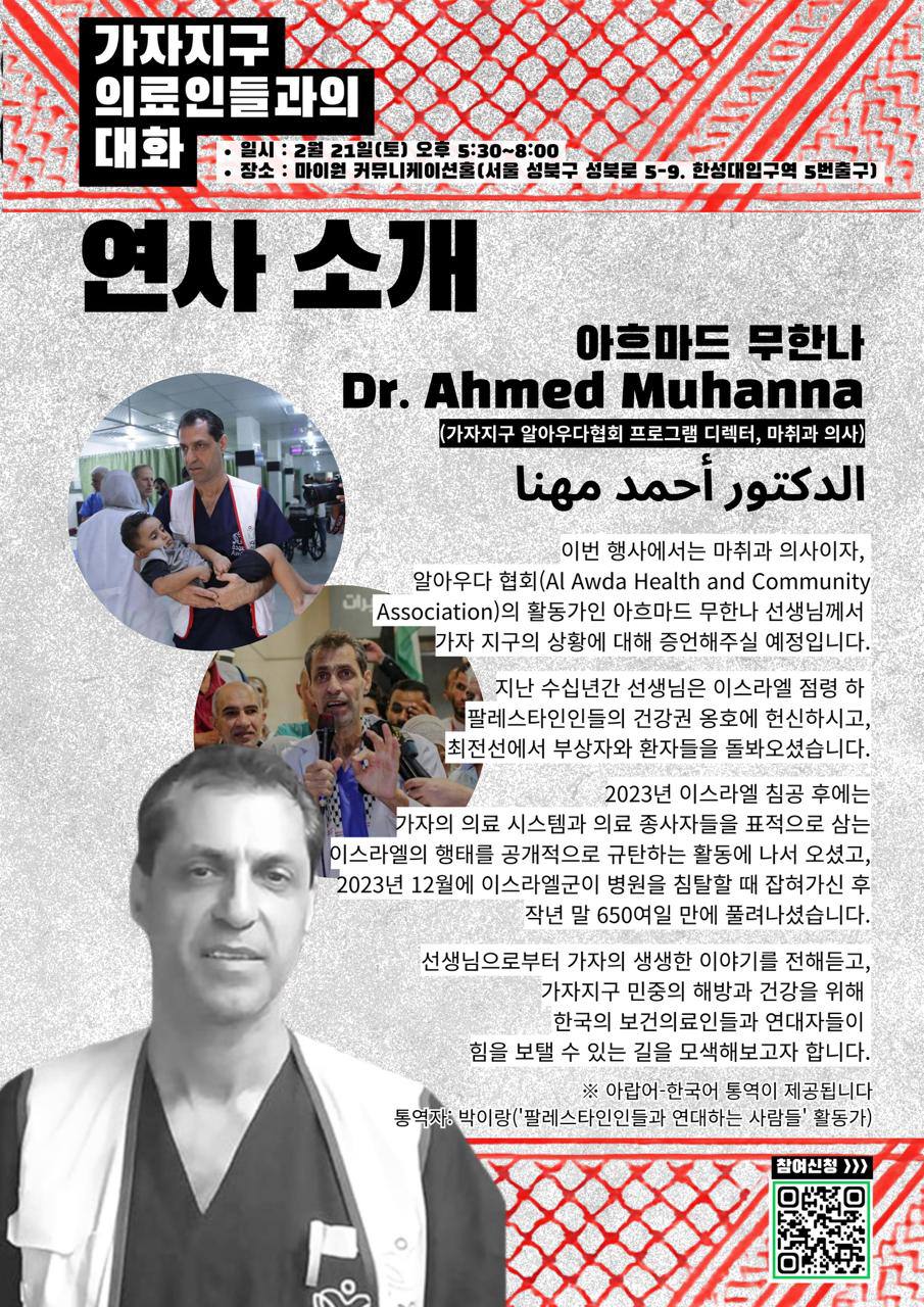 폭격으로 폐허가 된 삶의 터전에서도, 다시 생명을 구하고, 의료체계를 구축하기 위해 땀 흘리고 분투하는 가자지구 보건의료인들의 이야기를 듣고, 연대와 후원을 모색하는 자리에 여러분들을 초대합니다.