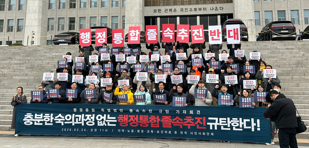 이재명 정부와 더불어민주당이 지방선거 일정에 맞춰 이른바 ‘행정통합 특별법’을 초고속으로 밀어붙이고 있다. 민주당은 오늘(24일) 대전·충남, 대구·경북, 광주·전남 등 3개 지역의 행정통합 특별법안을 본회의에서 우선 처리할 방침이라고 한다. 지난 9일 한 차례 공청회에 이어 12일 상임위 통과, 24일 본회의 상정 및 처리까지 속전속결로 추진하는 상황이다. 이 과정에서 주민 참여와 숙의는 실종된 채, 행정통합 논의가 각종 특례와 권한 배분을 둘러싼 정치적 이해관계의 장으로 변질되고 있다. 우리는 행정통합 졸속 추진을 강력히 규탄한다.