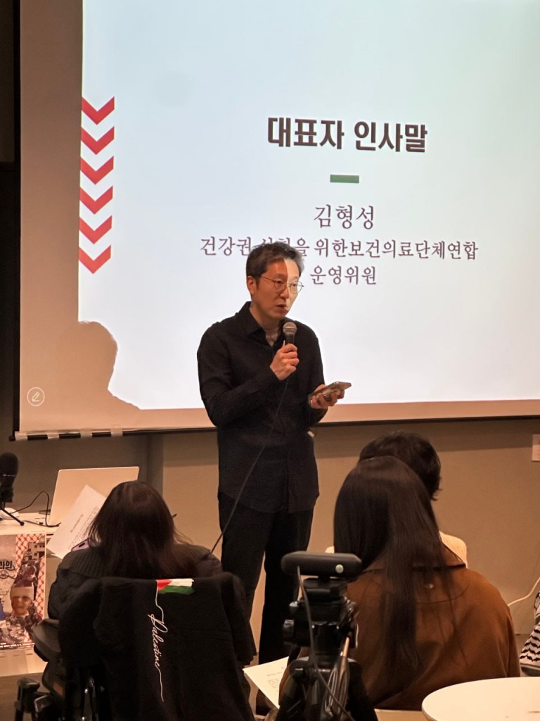 주최단체 대표들을 대표해 먼저 김형성 건강권 실현을 위한 보건의료단체연합 운영위원이 인삿말을 열었다. 그는 “전쟁은 중대한 보건의료 위기로, 보건의료인들에게 전쟁 반대는 가장 중요한 책임이자 의무”라고 말했다.