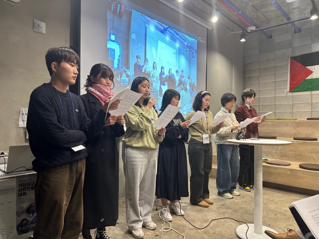 이탈리아 항만 노동자들은 이스라엘로 가는 군수물자를 싣지 않겠다면서 지난해 이후 계속 파업하고 있다. 이들은 자국 정부의 재무장과 긴축에 맞서며 팔레스타인인들과 연대하고 있다. 그리스, 튀르키예, 모로코 등의 항만 노동자들도 함께 싸웠다. 그 뿐인가. 가자 학살 이후로 지금까지 팔레스타인 연대운동의 물결이 미국과 유럽과 중동과 세계 각지에서 끊이지 않았고 한국도 그 일부였다. 그래서 우리는 희망을 잃지 않는다. 평화를 바라는 수많은 사람들이 있고 우리가 힘을 모은다면 세상을 바꿀 수 있다. 우리는 함께 이 자리에서 다짐한다. 팔레스타인 연대운동과 반전평화 운동을 키우고 생명의 가치를 지켜내기 위해 모든 노력을 다할 것이다.