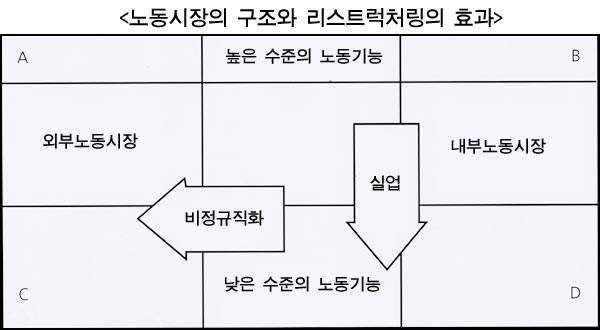 이 도표는 노동시장을 정태적으로 비교하는 방법으로서만 유용한 게 아니다. 이 도표는 서로 다른 나라에서 조직적 리스트럭처링이 노동자들에게 상이하게, 동태적으로 영향을 끼치는 방식들을 이해하는 데도 도움이 된다. 사용자들로 하여금 노동비용을 줄이도록 하는 유인은 어느 나라에서건 동일할는지 모르지만, 그에 따른 리스트럭처링의 모습은 나라마다 서로 다르다.