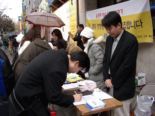 눈과 비가 오락가락 내리던 추운 날씨였지만 지나가는 시민들에게 1. 지역감정을 부추기는 후보를 찍지 않겠습니다 2. 부패척결에 노력하는 후보에게 투표하겠습니다 3. 선거자금을 투명하게 공개하는 후보에게 투표하겠습니다 4. 후보들의 정책을 꼼꼼히 따져보고 투표하겠습니다 라는 내용에 대한 유권자 약속을 받는 서명운동을 진행하였습니다.
