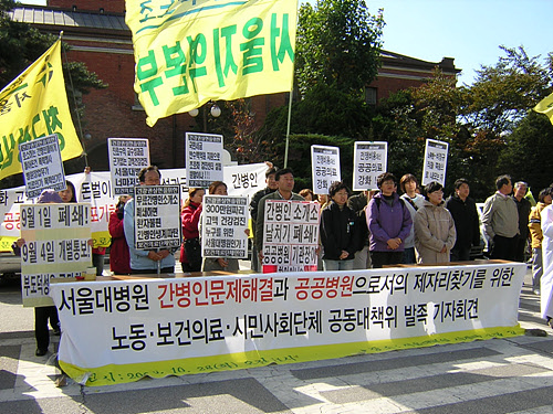 인권, 보건의료, 시민사회단체들이 서울대병원의 공공병원으로의 역할에 대한 문제를 제기하고 나섰다. 보건의료노조와 시민사회단체로 구성된 ‘서울대병원 간병인문제 해결과 공공병원으로의 제자리찾기를 위한 공동대책위’ 는 오늘 기자회견을 열어, 최근 ‘돈벌이’ 에 나선 서울대병원의 문제점을 지적하고 간병인 무료소개소를 폐쇄함에 따라 직장을 읽은 간병인 아주머니들과 함께 서울대병원 안에서 집회를 가졌다.