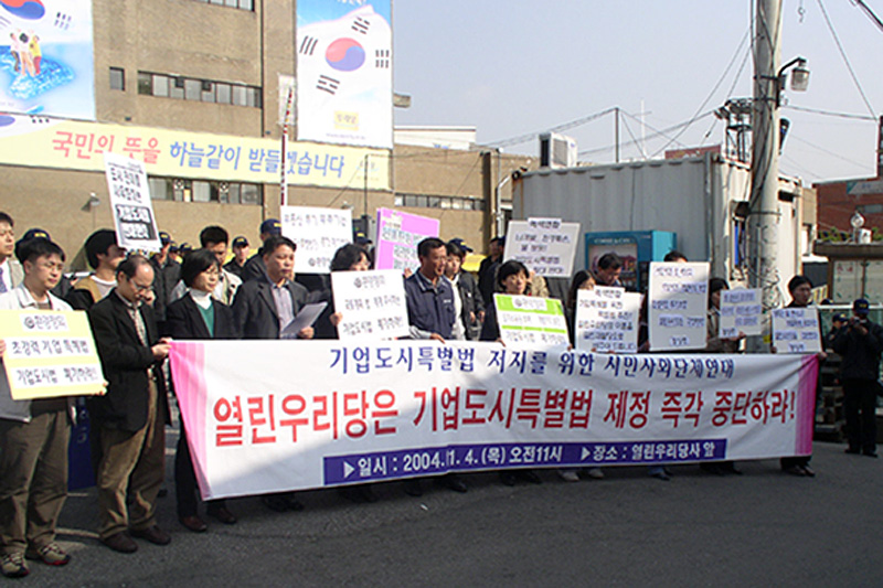 열린우리당은 기업이 잘되는 사회라는 구호 속에 서민들과 약자들을 무시한 재벌정책을 계속 해왔다. 우리 또한 기업들이 잘되는 것 자체를 거부하는 것은 아니다. 다만 ‘기업도시특별법’처럼 토지개발, 재벌정책, 세제, 노동, 환경, 교육, 의료 등과 관련한 모든 규제를 극소수 재벌만을 위해 완화해주는 ‘재벌특혜법’ 제정에 반대하는 것이고, 그 법을 기반으로 만들어지는 기업도시 즉 재벌도시를 반대하는 것이다.