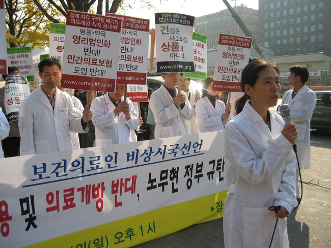 지난 11월 16일, 우리는 참으로 참혹한 소식을 접하였다. 한국 보건의료 시스템의 붕괴를 막기 위한 우리의 노력에도 불구하고, 노무현 정권은 이날 국무회의를 통해 경제자유구역내 외국인 병원의 내국인 진료를 허용했다. 이제 영리병원의 허용, 민간의료보험의 도입 등 의료가 시장화되는 물꼬가 트이기 시작한 것이다. 어찌 사태가 이 지경에 이르렀단 말인가!