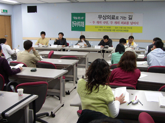 보건의료단체연합은 한국사회포럼의 테마토론 주제 중에 하나로 15일, <무상의료로 가는 길> 이라는 제목의 테마토론을 가졌다.