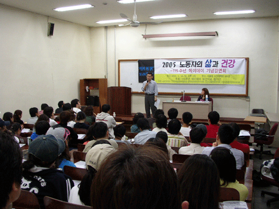 115주년 메이데이 보건의료 참가단 주최로 진행된 하종강선생님의 “2005 노동자의 삶과 건강” 강연회가 성황리에 진행되었습니다. 강연장을 꽉 메운 보건의료학생들의 모습에서 ‘노동자의 삶과 건강’ 에 대한 학생들의 관심을 엿볼 수 있었습니다. 또한 하종강선생님의 언제나 열띤 강연은 이날도 많은 학생들을 감동시켰습니다. 하종강 선생님의 생생한 사례들을 통한 노동자들의 삶과 건강은 보건의료 학생들에게 앞으로의 삶에 대한 진지한 고민과 성찰의 기회를 주었을 것입니다.