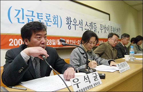 우석균 정책국장은 과학기술에만 집중하는 정부와 황 교수 옹호 세력을 비판했다. 우 국장은 “‘황 교수 살리기’는 사회적으로 희망이 보이지 않고, 양극화가 심화되는 등 전체적으로 어려운 상태에서 ‘황 교수가 희망’이라는 사회 인식을 반영한 것”이라며 “거기서 나온 것이 ‘윤리가 밥 먹여주냐’는 의식”이라고 주장했다.