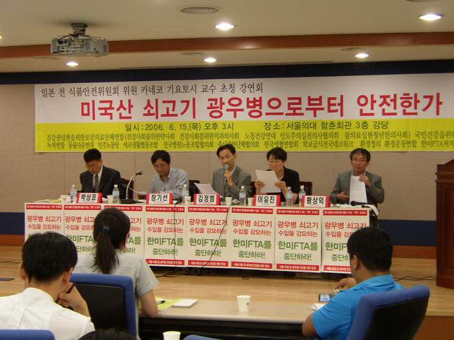 보건의료단체연합, 국민건강을위한수의사연대, 녹색연합 등 17개 시민ㆍ사회단체로 구성된 ‘식품 위생 및 광우병 안전 연대’는 15일 서울 연건동 서울대의대 함춘회관에서 토론회를 열어 미국산 쇠고기의 수입 재개를 밀어붙이려는 노무현 정부를 강하게 비판했다.
