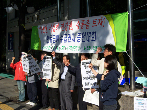 이현옥 건강세상네트워크 공공의료팀장은 “건강생활유지비 6천원이 턱없이 부족하거나 여러 질병에 시달려 선택병의원 이외의 다른 병원을 이용하다가 진료비 부담이 큰 수급권자도 많다”며 “본인부담금제, 선택병의원제 등 새 제도 시행으로 의료급여 수급권자들의 의료이용이 크게 제한됐다”고 말했다. 증언이 끝난 뒤 의료급여개혁공동행동은 “정부가 재정 절감을 목적으로 의료급여 제도를 세분화하고 복잡하게 해 빈곤층이 필요한 의료마저도 이용하지 못하게 하고 있다”며 △진료비 본인 부담 △선택병의원제 △파스 비급여 등 빈곤층의 의료이용을 가로막는 새 제도를 즉각 철회하라”고 주장했다.