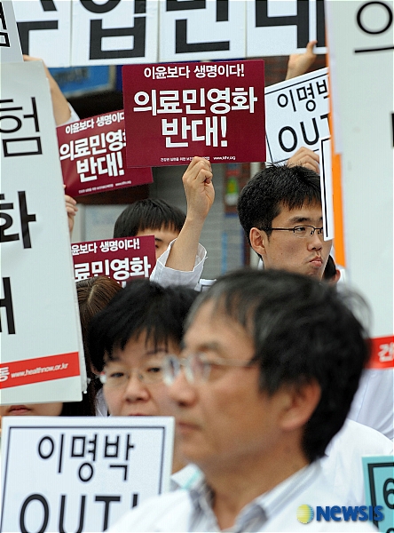 4. 우리는 또한 이명박 정부가 영리병원 도입을 비롯한 민영의료보험 활성화 정책과 건강보험재정축소 등 의료민영화 정책 추진을 즉각 중단할 것을 분명히 요구한다. 제주도에서의 의료민영화 정책거부는 촛불민심이 무엇인가를 분명히 보여주었다. 이명박 정부는 겉으로는 건강보험민영화가 없다면서 뒤로는 의료민영화정책을 추진하는 꼼수정책을 즉시 중단해야 한다. (끝)