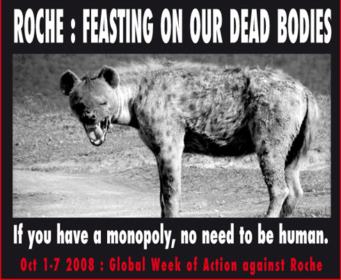 우리는 이 과정을 다른 나라의 단체들에게 알리기로 했다. 9월부터 한국 로슈의 푸제온 대응에 대한 내용을 각국에 메일로 보내고 이에 대한 항의 연명을 받고자 하였다. 그러나 단지 연명뿐이 아니었다. 파리의 ACT UP이라는 단체에서 아이디어를 보내 주었다. 로슈 창립일인 10월 1일을 전후로 하여 반인권적이고 부도덕한 로슈를 규탄하는 행동을 함께 하고 싶다는 것이었다. 하이에나 이미지를 넣은 선전물도 보내왔다.