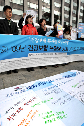둘째, 이명박 정부는 건강보험보장성 강화를 위해서는 국민들이 추가부담을 해야한다고 한다. 정부 보장성 강화방안을 살펴보면, 보장성을 강화하는 방법으로 4개의 안을 제시하고 그 안을 실현하기 위해서는 각각 몇 퍼센트의 보험료인상이 필요하다고 주장하는 안이다. 이것은 마치 건강보험의 보장성을 조금이라도 올리려면 ‘니네들이 보험료를 더내라’는 식의 협박이상이 아니다. 경제위기시기에 이것이 과연 국민의 건강을 책임져야 할 한 국가의 역할인가. 국민들이 돈 더내고 덜 이용해서 발생된 흑자분을 국민들에게 다시 돌려줄 방안을 내놓아야 하는 것이 우선이다. 또한 경제 위기로 인한 국민들의 고통을 덜기 위한 사회보장 강화방안이 마련되어야 한다. 보험료 인상만으로 보장성 강화를 조건화하는 것은 정부의 역할 방기다.