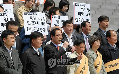 또한 우리는 민주당이 한나라당과 함께 한미 FTA를 통과시킨 공범임을 분명히 하고자 한다. 민주당의 전신인 열린우리당 또한 한미 FTA를 비준시킨 지난 정권의 여당으로서 역사적 책임이 있을 뿐만 아니라 이미 세계경제위기로 한미 FTA가 역사적 유물이 되었음에도 불구하고 민주당은 자신의 당론으로 한미 FTA 반대 입장을 채택하지 않았다. 그 뿐만아니라 한나라당과 민주당이 유일하게 맞붙는 4.29 부평을 보궐선거에 한미 FTA 국내대책본부장을 맡았던 홍영표씨를 후보로 내세움으로서 거꾸로 한미 FTA에 대한 자신의 지지 입장을 분명히 행동으로 보여주었다.