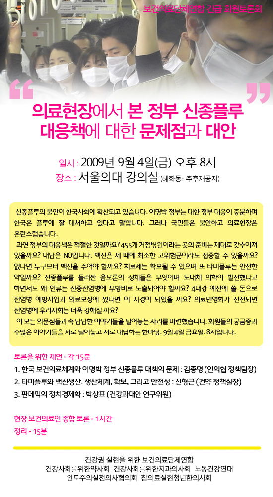 신종 인플루엔자(H1N1 influenza 2009, novel influenza, 이하 신종 플루)가 한국사회에서 급속히 확산되면서 시민들의 공포와 불안도 확산되고 있다. 최악의 경우 1000만명 이상의 감염과 1만명 이상의 사망이 예견되는 상황에서는 국민들의 불안과 공포는 당연한 상황이다. 그러나 이러한 시민들의 불안에 답해야할 정부는 이에 대한 답을 내놓지 못하고 있다. 한국 정부는 시민사회단체의 수년전부터의 지속적인 요구에도 불구하고 전혀 대비를 하지 못해 결국 국민들을 위험에 노출시키는 상황을 자초했다. 수년의 기간이 있었음에도 인플루엔자 치료제에 대한 확보노력을 하지 않아 비축의약품을 턱없이 부족한 현실이 됐고, 국영백신생산시설 확보 시기가 늦어 결국 국민들에게 적절한 시기에 백신을 제공할 수 없는 상태에 놓여졌다.