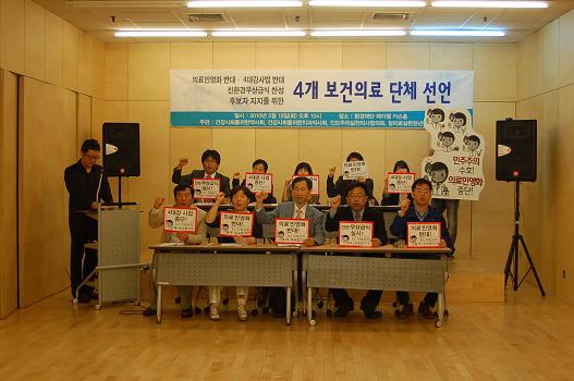 2010년 6월 2일 실시되는 지방자치체 선거를 맞이하여 우리 건강사회를위한약사회, 건강사회를 위한 치과의사회, 인도주의실천의사협의회, 참의료실현청년한의사회 4개 단체는 이번 지방선거가 단순히 지역 대표자를 뽑는 정치적 절차를 넘어 이 땅의 민주주의의 미래를 좌우하는 막중하고도 시급한 분수령이 될 것이라는데 공감하며, 우리의 역할과 책임을 기꺼이 수행하기 위해 다음과 같이 선언한다.