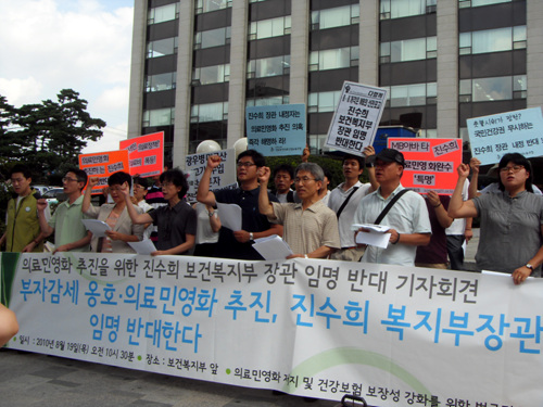 보건복지분야에서의 경험이 전무하고 전문성도 없는 정치인이 친 MB 인사라는 이유만으로 복지부장관에 내정되었다. 무슨 의미일까? 이는 이명박정부가 추진하려했던 의료민영화조치를 이번에 밀어붙이기 위한 것이라고 밖에 볼 수 없다.