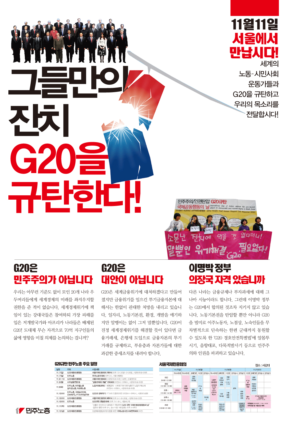 G20 정상회의는 임기응변식 수선으로 신자유주의 금융세계화의 문제를 덮고 자신들의 기득권을 지키려고 한다. 진정한 위기 해결을 위한 대안이 되기 위해서는 민중을 중심에 두고, 이들의 삶을 지속가능하게 하는 방향에서 이들의 주체적 참여를 통해 설계되지 않으면 안 된다. 그러자면 기존의 신자유주의적 세계화의 틀을 근본적으로 재검토하고 변화시켜야 한다. 지난 30여 년 동안 진행된 자본의 세계화, 빈곤의 세계화를 공정하고 대안적인 세계화로 전환시켜야 한다. 신자유주의와 자본의 권력에서 벗어난 다른 세상은 가능하다. 세계 사회운동의 연대를 통해 공정하고 생태적인 사회를 향해 나아가자.