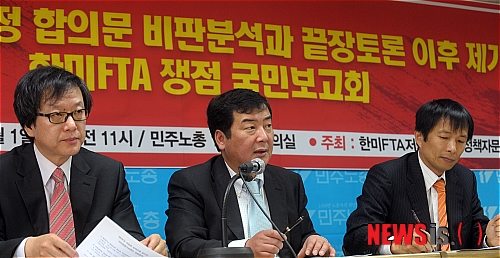 한·미FTA저지범국민운동본부 정책자문위원회는 1일 서울 정동 민주노총에서 ‘한·미 FTA 쟁점 국민보고회’를 열고 최근 국회에서 진행된 끝장토론의 성과로 밝혀진 15대 한·미 자유무역협정(FTA) 의제를 발표했다. 정책자문위는 “국회 끝장토론에서 제기됐지만 해결되지 않은 쟁점들을 정리해 국민에게 보고하는 자리”라고 밝혔다. 보고회에는 끝장토론에서 야당 측 진술인이었던 민주사회를위한변호사모임 송기호 변호사, 한신대 이해영 교수, 보건의료단체연합 우석균 정책실장, 남희섭 변리사 등이 참여했다.