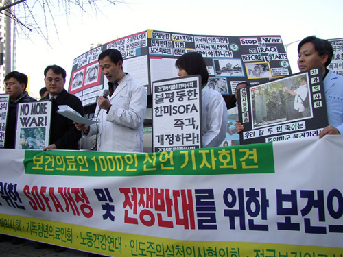 우리는 효순이와 미선이의 죽음 앞에서 한반도의 굴욕적인 현실과 함께 아프가니스탄과 이라크의 제2, 제3의 효순이와 미선이를 생각한다. 유엔의 보고에 따르면 91년의 공격으로 이라크 국민 20만명이 사망했고 계속된 경제봉쇄로 전체 150만 명 이상, 어린이만 60만명이상이 사망했다. 아무런 방어능력을 갖추지 못한 아프카니스탄에 대한 공격으로 얼마나 많은 어린이들이 죽어갔는가. 그리나 이제 미국은 또 국제법을 어기고 아무런 국제적 합의도 거치지 않은 채 석유과 패권을 위해 이라크를 공격하려 한다. 보건의료단체들은 아프가니스탄에 대한 미국의 침공 때 그에 대한 반대입장을 밝힌 바 있다. 이제 우리는 수많은 명분에 의해 합리화 될 또 다른 미선이와 효순이를 만들 미국의 이라크침공에 반대입장을 분명히 한다. 아울러 이러한 전쟁에 군수지원이나 의무병지원을 하려는 한국정부의 결정에 대해서도 반대의 입장을 분명히 한다. 어떤 명분으로도 인간의 생명을 앗아가는 폭력과 살인은 합리화 될 수 없다. 우리 보건의료인들은 인간의 생명을 앗아가는 모든 폭력과 전쟁에 반대한다는 것을 분명히 밝힌다.
