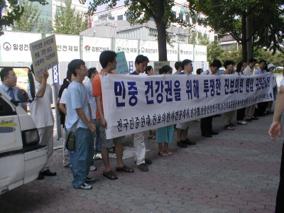 31일 권정기, 이상이 두 회원의 진보의련 이적 판결 항소심 첫 심리에 앞서 오전 10시 법원앞에서는 진보의련 공대위에서 주최하는”국가보안법 철폐와 권정기, 이상이 무죄판결 촉구 결의대회”가 있었습니다. 이날 집회에는 당사자인 권정기, 이상이 두 회원을 비롯, 인의협 공동대표 김정범, 청한 이영욱, 강주성 건강세상네트워크 공동대표, 최창우 국가보안법폐지시민모임 대표등 약 40여명의 참가자들이 모여 권정기, 이상이 두 회원에게 이적 판결을 내린 법원을 규탄하고 항소심에서라도 두 분에게 무죄판결을 내릴 것을 촉구하였습니다. 이 날 집회에는 보건연합에서 인의협과 청한, 건강세상네트워크, 전국한의과대학생회연합, 민주노동당 인권위원회, 민주노동당 강남갑 지구당, 평등연대, 서울대학생정치위원회, 학생연대회의, 성신여대 총학생회, 경희대 한의대 학생회등의 단체가 참여했습니다.