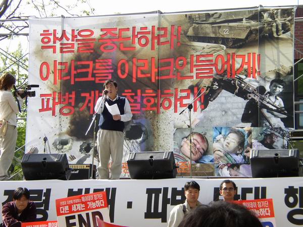 본 집회 첫 연사로 나선 우석균 보건의료단체연합 정책국장은 “대량살상무기를 발견하지 못한 미국은 이라크 침략의 명분으로 후세인 축출을 통한 민주주의 수호라고 말을 바꿔 주장하고 있다”며 “이라크 민중에 대한 대규모 학살이 바로 미국식 민주주의인가”며 미국의 이라크 침략을 비판했다.