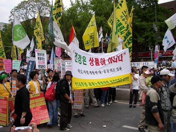 우리 노동자들의 건강권을 지키는 일은 정부가 주장하는 세계화, 즉 의료개방, 영리법인허용, 민간보험도입이 아닙니다. 우리 노동자들의 주장은 전쟁지원 할 돈을 의료보장으로, 부자에게 세금을 걷어 혜택을 받지 못하는 노동자 서민의 건강을 지키지 위해 써야 한다는 것입니다. 이것이 바로 무상의료, 공공병원강화, 의료개방반대입니다.