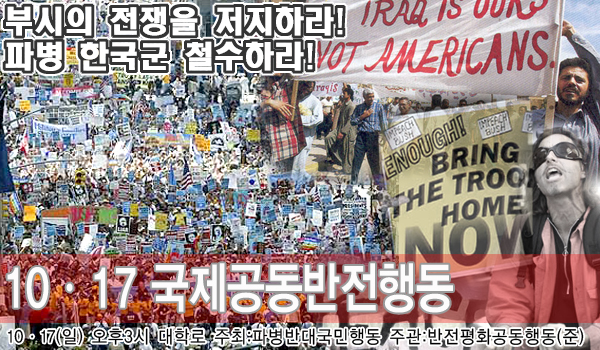 미군의 이라크 철군을 요구하는 10.17 국제반전공동행동’이 파병반대국민행동 주최로 대학로에서 진행됐다. 1,000여 명의 집회 참석자들은 “이라크 민중을 학살하는 전쟁은 즉각 중단되야 한다”라고 요구하며 ‘전범자인 노무현정부’를 강도 높게 비판했다. 이날은 반전 국제공동행동의 날로 미국 워싱톤에서는 100만노동자 행진이 진행됐고, 유럽의 반전활동 단체들은 유럽사회포럼의 폐막 행사로 반전집회를 개최했다.