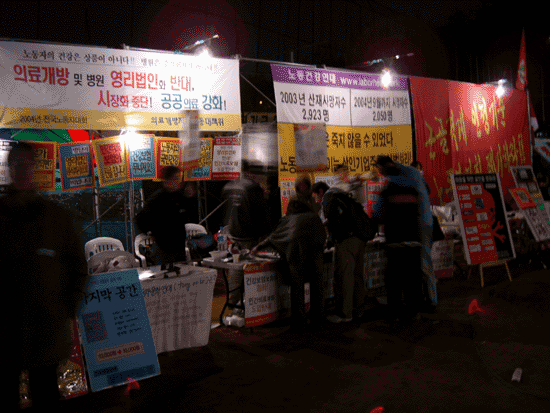 전태일열사 정신계승 2004년 전국노동자대회가 열렸습니다. 보건의료단체연합은 의료개방저지공대위 소속 단체 및 회원들과 함께 노동자대회 전야제에 “의료시장화 및 병원 영리법인화 반대” 부스를 설치하고 전국에서 모인 노동자들에게 병원 영리법인화와 의료 사유화로 인한 민간의료보험도입이 노동자 건강에 미칠 영향에 대해 선전과 캠페인을 진행했습니다.