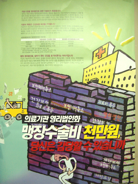 지금도 의료비가 비싸고 병원문턱이 높아, 많은 서민들이 진료조차 못 받고 죽음을 맞이하는 게 한국이 현실이다. 이러한 상황에서 국민의 건강을 책임진다는 한 국가의 정부가 하는 일이 기업과 이해 관련업계 대표자들을 모아놓고 병원을 기업화하고 국민의 건강보험체계를 양분하는 짓인가?