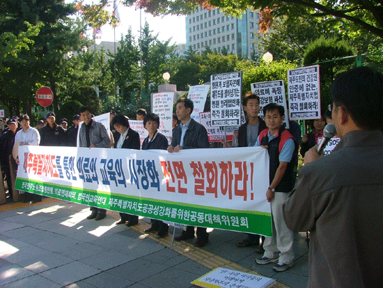 14일(금) 오후 3시 세종로 정부종합청사 앞에서 제주특별자치도 추진위원들과 16개 부처장관 회의가 개최되었다. 이에 보건의료단체연합을 비롯한 노동 시민사회단체는 제주특별자치도 기본계획안은 교육, 의료, 노동시장의 개방을 담고 있으며, 이는 교육비와 의료비의 폭등을 가져와 불평등을 더욱 심화시킬 뿐 아니라 그나마 취약한 공공의료 및 공교육 체계의 근간을 흔들 것이라고 경고하고 항의하는 기자회견을 가졌다.
