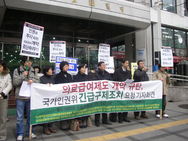 오늘 모인 우리 시민사회단체들은 정부의 의료급여법 시행령, 시행규칙 개정이 가난한 이들의 건강권을 심각하게 침해하고 그들을 차별하는 조치라고 인식하며 이의 즉각적인 철회를 요구한다. 정부가 지금 해야 할 일이 빈자들의 치료권을 박탈하는 일인가? 복지부장관이 해야 할 일이 우리사회의 가장 취약한 계층을 보호하기는커녕 돈을 많이 썼다고 세금을 축낸다고 비난하고 그들에게 짐을 더 지우는 일이란 말인가? 우리는 오늘 진행할 국가인권위 긴급구제 요청을 비롯하여 의료급여 수급권자의 증언을 듣는 자리를 마련하고 헌법소원과 행정 소송을 제기하는 등 의료급여제도 개악안을 저지하기 위한 모든 노력을 기울일 것임을 밝힌다. 정부는 의료급여제도 개악안을 즉각 철회하라!