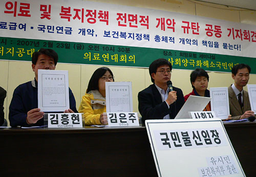 우리 시민사회단체들은 참여정부의 최근의 보건복지정책이 국민연금의 개악, 의료급여제도의 개악, 의료법 개악 및 건강보험 소액진료 본인부담금의 대폭인상 등에서 나타나듯 전면 후퇴하고 있다고 판단한다. 현재 유시민 보건복지부장관은 이러한 제도의 개정을 마치 개혁인 것처럼 주장하고 있다. 그러나 그 내용을 보면 노후보장제도의 축소, 빈자들의 의료이용에 대한 경제적 부담의 증대, 의료양극화 심화, 전면적 시장화 조치 등으로 개혁과는 거리가 멀뿐 아니라 전면적 개악이라고 부르기에 충분하다. 또한 참여정부는 이러한 제도개정이 마치 사회적 합의과정을 거치면서 진행되는 것처럼 주장하나 실제로는 아무런 사회적 합의과정과 국민적 설득 없이 추진되고 있다. 더욱이 현재 개악이 진행되고 있거나 시도되고 있는 제도들은 하나같이 우리나라의 사회복지 및 의료제도의 근간이자 핵심제도라는 점에서 우리 시민사회단체들이 가지는 우려는 매우 크다. 우리는 이와 관련하여 다음과 같이 의견을 밝힌다.