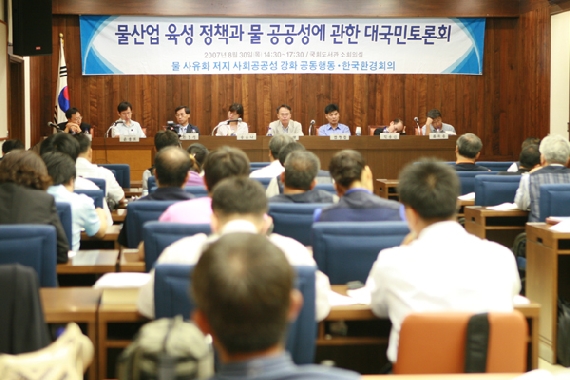 물 사유화 저지 사회공공성 강화 공동행동과 한국환경회의는 30일 오후 2시30분부터 6시까지 국회도서관 소회의실에서 ‘물산업 육성정책과 물 공공성에 관한 대국민 토론회’를 열었다. 단병호 우원식 제종길의원실의 후원으로 열린 이날 대국민토론회는 홍성태 상지대 문화컨텐츠학과 교수의 사회로 △정부의 물산업육성 정책 비판과 공공적 상수도체계를 위한 대안(송유나 물사유화저지 공동행동 연구팀) △물산업육성법의 문제점과 친환경적 물정책의 방향(염형철 환경운동연합 생태사회본부 처장)에 대한 발제와 윤웅로 환경부 물산업육성과 서기관, 민경석 경북대 환경공학과 교수, 류휘종 우원식 의원실 비서관, 김홍석 단병호 의원실 보좌관, 박용신 환경정의 협동사무처장 등 다섯 명의 패널토론, 질의응답 및 자유토론으로 진행됐다.