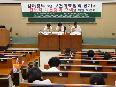 1. 보건의료단체연합은 민주노동당 진보의료연구회와 공동으로 대선 연속기획토론회 제 3차 ‘참여정부 5년 보건의료정책 평가와 진보적 대선정책 모색을 위한’ 토론회를 개최하였다. 조홍준 (울산의대 교수, 전 의료연대회의 정책위원장)의 사회로 1부에서는 참여정부 5년의 보건의료정책의 평가가 이루어졌으며, 2부에서는 대선과 총선시기에 진보진영의 보건의료정책과 그 운동 전략으로 무상의료운동의 실현을 위한 토론이 진행되었다.